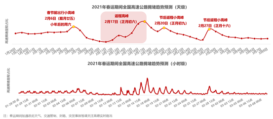 2021年春运预测:全国高速日均拥堵里程同比去年下降约三成1月25日,高德地图发布2021年度春运出行预测:今年春运从1月28日开始,3月8日结束,共计40天。在疫情防控、鼓励留下过年的背景下,全国高速出行会相对分散,节前全国高速日均拥堵里程将同比去年下降约三成。预计2月13日(正月初二)出现拥堵小高峰,2月15日(正月初四)开始拥堵逐渐上升,2月17日(正月初六)出现返程高峰。与此同时,公共交通的出行拥挤度也会大大下降。官方数据显示,春运前火车票预售较往年同期下降近六成。