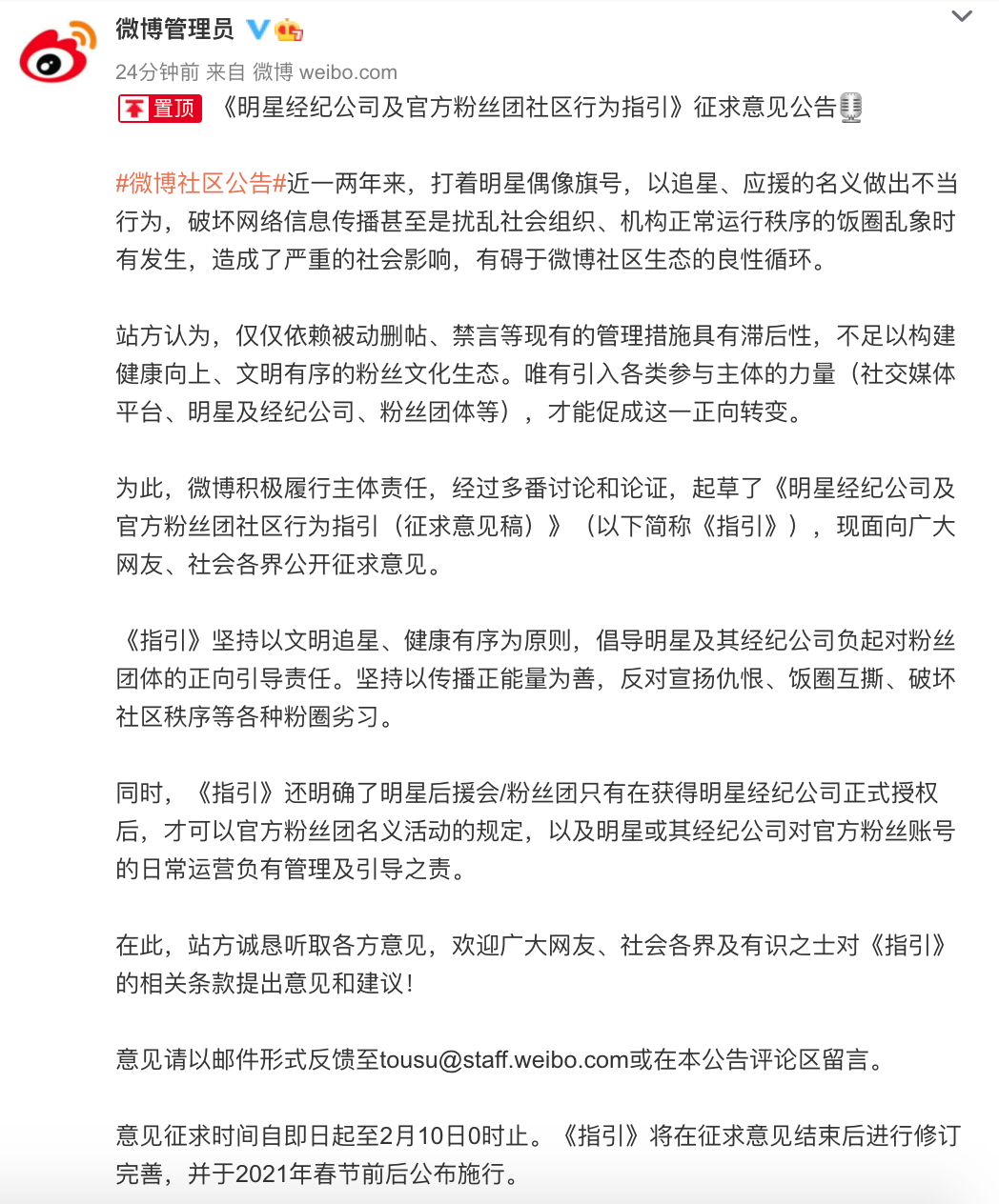 微博发布《明星经纪公司及官方粉丝团社区行为指引》征求意见稿。《指引》坚持以文明追星、健康有序为原则,倡导明星及其经纪公司负起对粉丝团体的正向引导责任。坚持以传播正能量为善,反对宣扬仇恨、饭圈互撕、破坏社区秩序等各种粉圈劣习。同时,《指引》还明确了明星后援会/粉丝团只有在获得明星经纪公司正式授权后,才可以官方粉丝团名义活动的规定,以及明星或其经纪公司对官方粉丝账号的日常运营负有管理及引导之责。