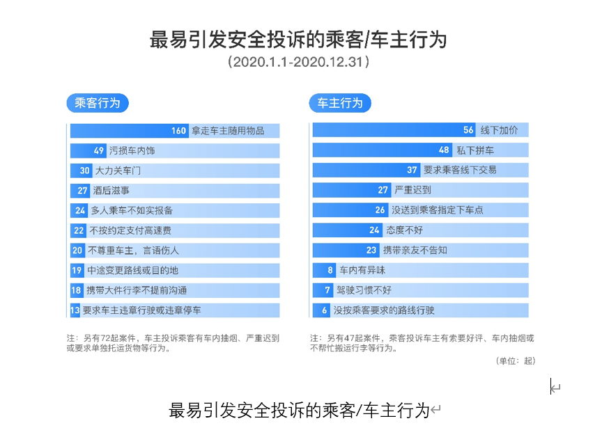 在763起非骚扰类安全投诉中,用户拿走车主随用物品、污损车内饰、大力关车门位列易引发安全投诉的乘客行为前三,分别引起安全投诉160起、49起、30起;车主行为中,线下加价、私下拼车、要求乘客线下交易引发的投诉最多,分别为56起、48起、37起,占对车主安全投诉总数的46%。