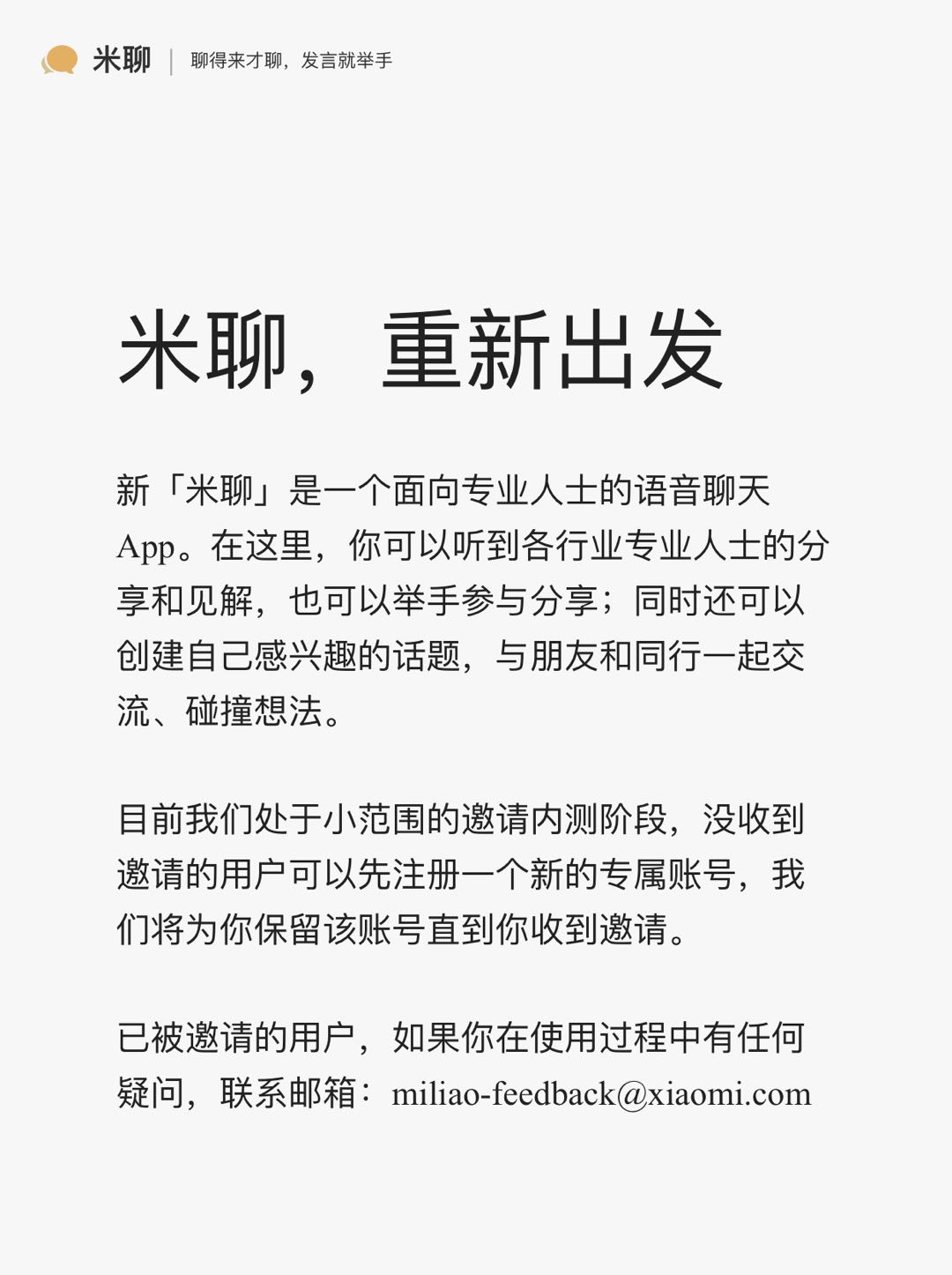 米聊“复活”:变成面向专业人士的语音聊天App。据米聊官网显示,米聊宣布重新出发,新“米聊”是一个面向专业人士的语音聊天App。“在这里,你可以听到各行业专业人士的分享和见解,也可以举手参与分享;同时还可以创建自己感兴趣的话题,与朋友和同行一起交流、碰撞想法。”目前新米聊处于小范围的邀请内测阶段,没收到邀请的用户可以先注册一个新的专属账号,米聊官方将为你保留该账号直到你收到邀请。