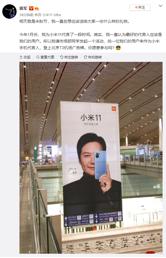 雷军:要找用户作为小米手机代言人,登上北京T3机场广告牌。4月5日晚间,雷军在其个人微博发文称,他认为小米最好的代言人应该是小米用户,因此请市场部发起一个活动,即寻找一位用户作为小米手机代言人,登上北京T3机场广告牌。
