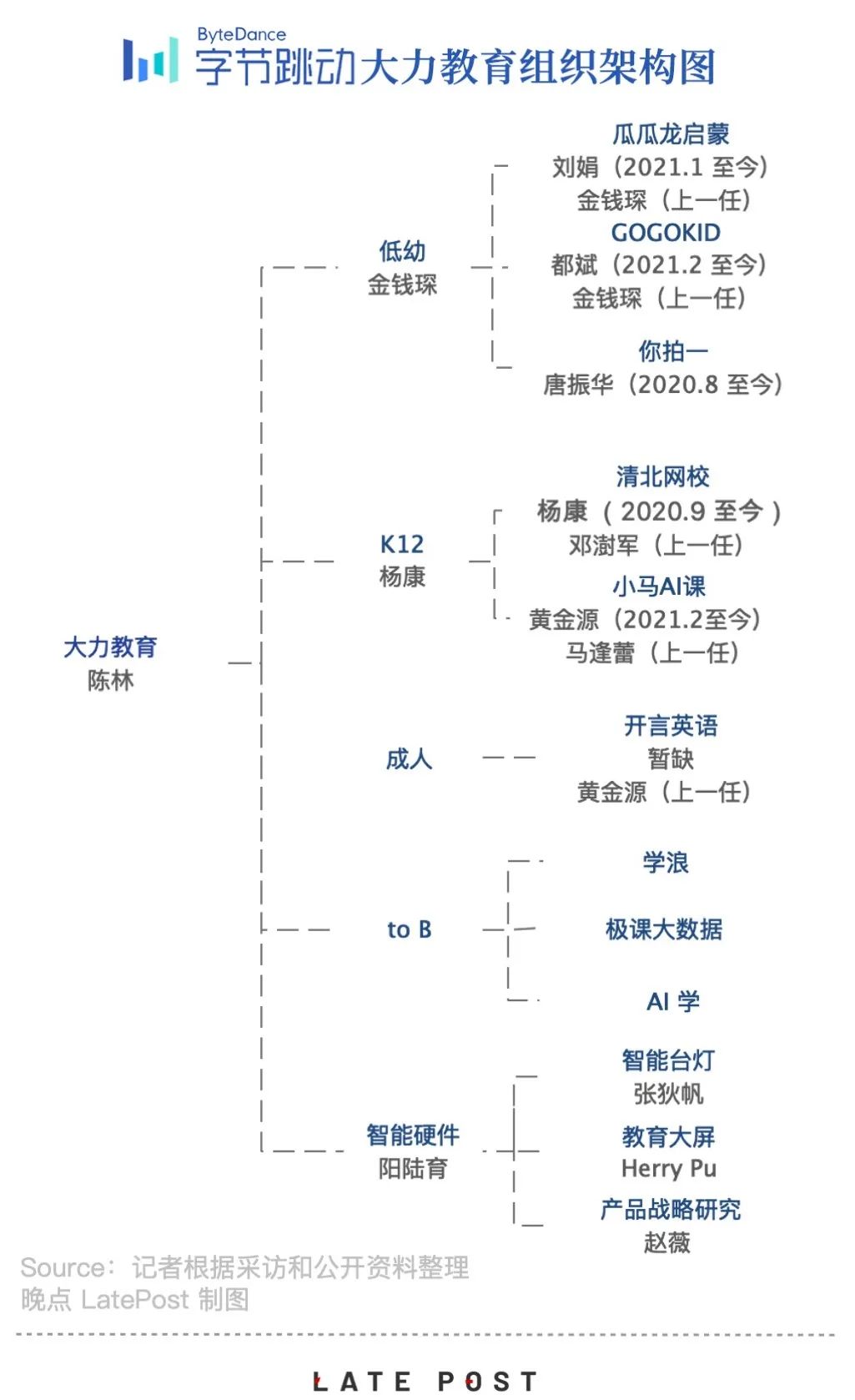 据《晚点 LatePost》独家获悉,包括儿童启蒙产品瓜瓜龙、中小学网校清北网校、成人语言产品开言英语、硬件业务大力智能等在内的重点项目,在过去一年里均有至少一次业务线负责人更替,不包括调岗,部分项目上百人离职。