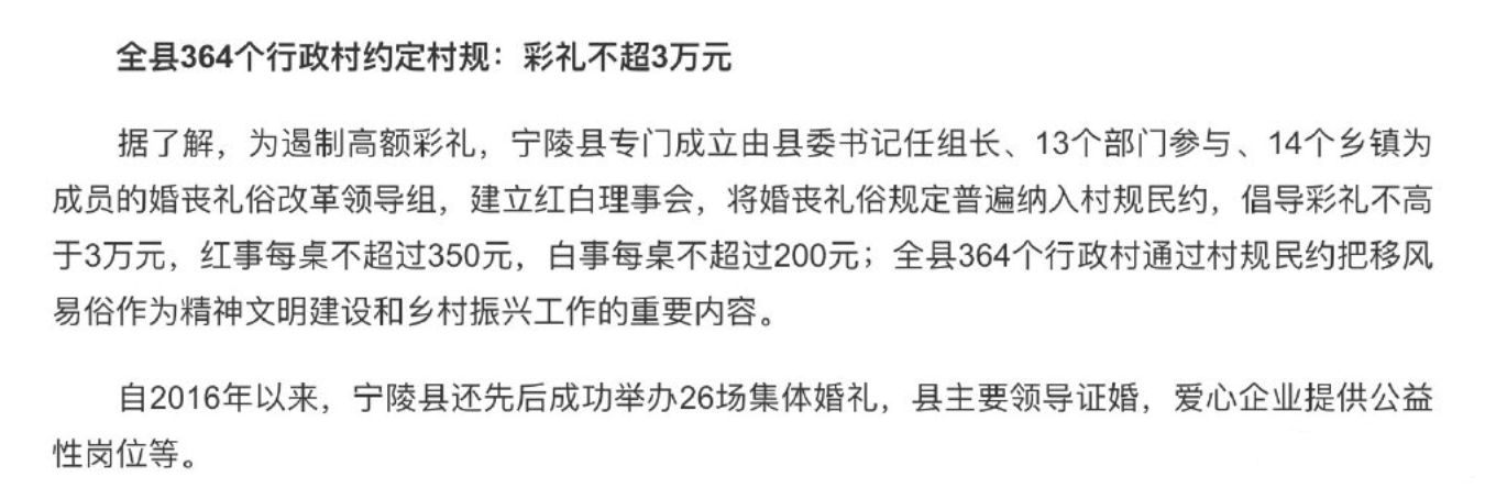 河南宁陵县规定彩礼不超3万元:提倡举办集体婚礼。为遏制高额彩礼,河南省商丘市宁陵县专门成立由县委书记任组长、13个部门参与、14个乡镇为成员的婚丧礼俗改革领导组,建立红白理事会,将婚丧礼俗规定普遍纳入村规民约,倡导彩礼不高于3万元,红事每桌不超过350元,白事每桌不超过200元;全县364个行政村通过村规民约把移风易俗作为精神文明建设和乡村振兴工作的重要内容。自2016年以来,宁陵县先后成功举办26场集体婚礼,县主要领导证婚。