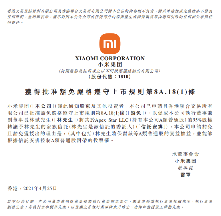 小米集团:获批豁免严格遵守上市规则相关条款。4月25日,小米集团公告,已申请且港交所已批准豁免严格遵守上市规则第8A.18(1)条,以促成公司执行董事兼副董事长林斌将其于Apex Star LLC(持有公司A类普通股)95%股权转让予其家族信托。