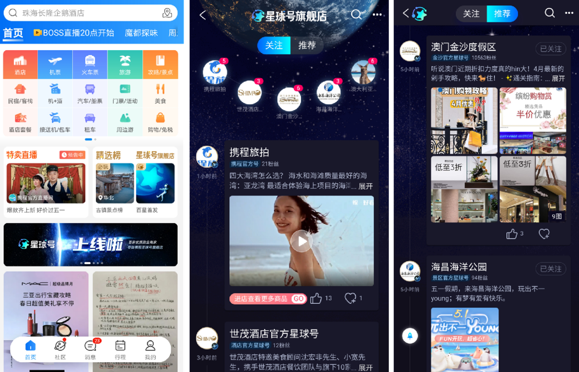 4月28日,星球号旗舰店频道在携程App首页上线。据携程介绍,首批入驻该频道的是百余家旅游业顶级商家,覆盖了来自全球的70余家综合度假区、景区、40余家酒店集团、文旅业主集团、以及10余个目的地旅游局等。入驻后可以在官方星球号发布动态、商品并与粉丝互动。