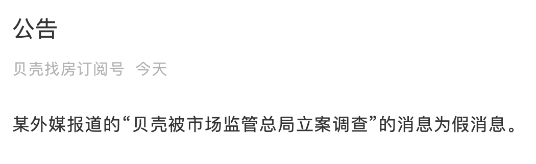 贝壳回应“被市场监管总局立案调查”:假消息。