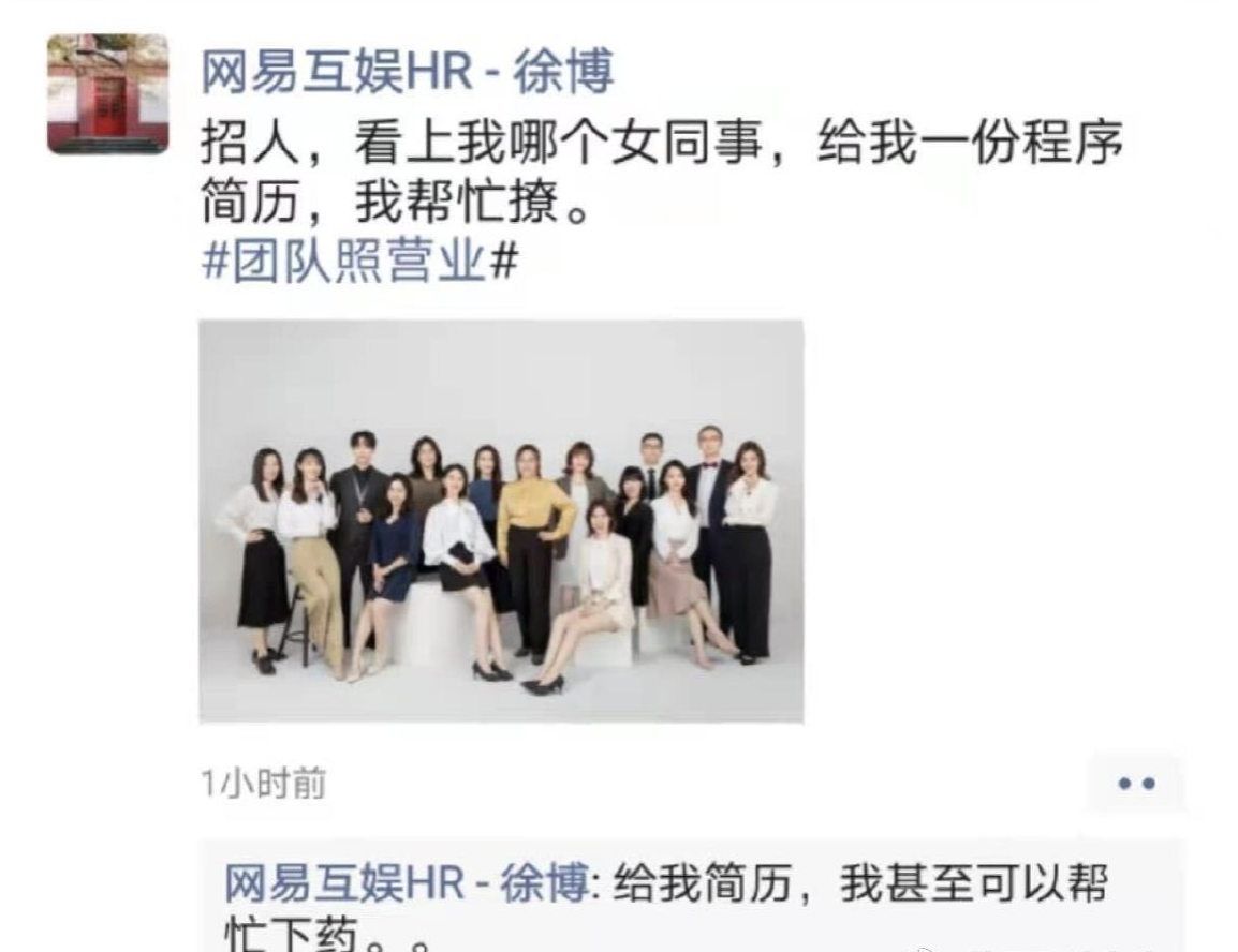 疑似网易互娱HR招人:看上哪个女同事,可以帮忙下药;网易回应:正调查。据三言财经,今日有网友爆料称,网易互娱一名HR在朋友圈发招人信息:招人,看上我哪个女同事可以帮忙撩,甚至可以帮忙下药。此言论被网友认为是歧视女性,并在网易游戏微博下留言:你们HR给人下药了不管?公然把女同事当作“性资源”,置国家法律和公司名誉于何地?据悉,该HR已经删除了朋友圈,并发布了道歉信。网易回应称网易道德委员会已经接到举报,现已正式受理进行调查。