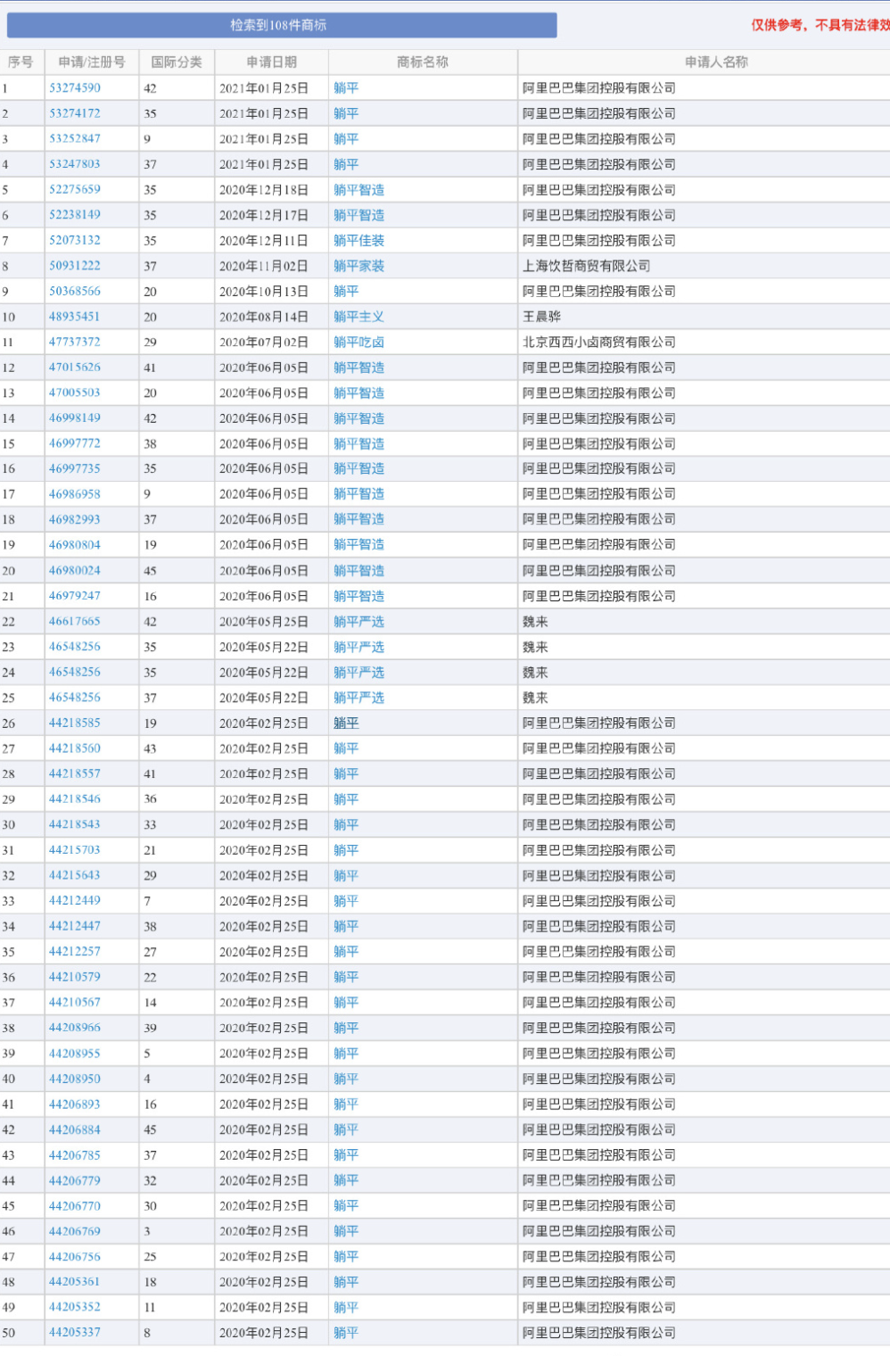 阿里注册躺平商标👀据悉,“躺平”商标已被阿里巴巴集团控股有限公司申请注册,国际分类涉及网站服务、广告销售等,申请日期为2021年1月,当前商标状态为“等待实质审查”。企查查显示,阿里巴巴目前共申请注册躺平商标91次,其中56个商标已注册,包含躺平、躺平设计家、躺大平。