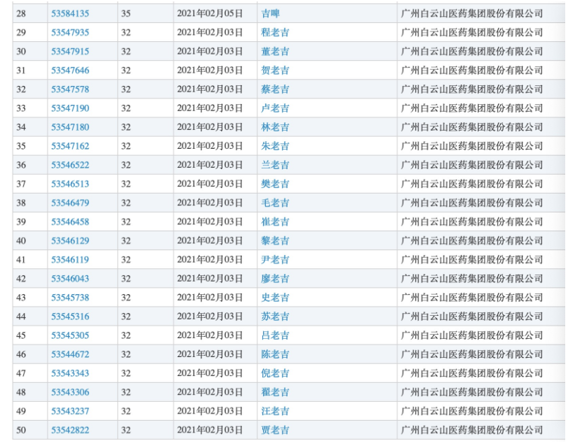 “萧老吉、程老吉、赵老吉、孙老吉……”中国商标网公开信息显示,这些商标均是在2021年2月3日一天之内申请的,共计100个。且这些商标申请的均非30类凉茶商品,而是在32类啤酒、茶味非酒精饮料、果汁等商品中。