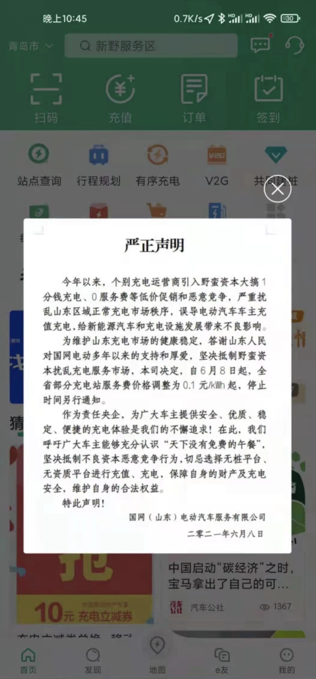 除此之外,国网(山东)电动汽车服务有限公司还在声明中呼吁广大车主,要能够充分认识天下没有免费的午餐,坚决抵制不良资本恶意竞争行为。