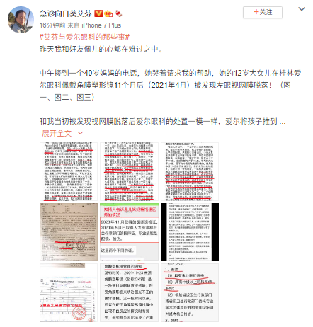 6月19日,艾芬微博再发声,表示遇到了和自己相似遭遇的一名患者,据艾芬表示,一个40岁妈妈向她电话求助,这位妈妈的12岁大女儿在桂林爱尔眼科佩戴角膜塑形镜11个月后(2021年4月)被发现左眼视网膜脱落。