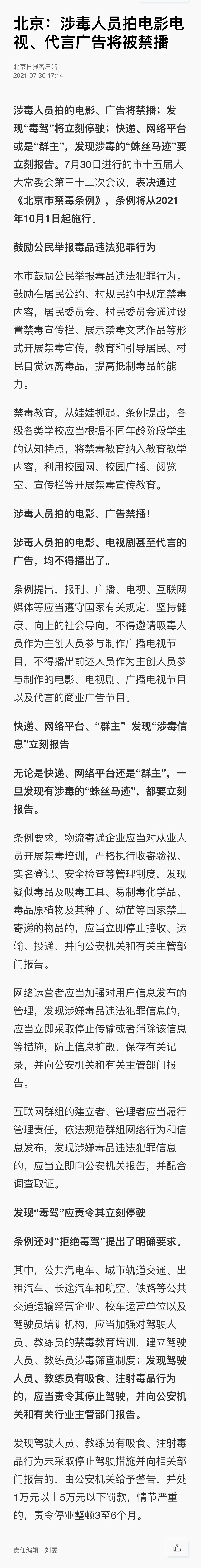 北京:涉毒人员拍电影电视和广告将被禁播。7月30日进行的市十五届人大常委会第三十二次会议,表决通过《北京市禁毒条例》,条例将从2021年10月1日起施行。涉毒人员拍的电影、广告将禁播;发现“毒驾”将立刻停驶;快递、网络平台或是“群主”,发现涉毒的“蛛丝马迹”要立刻报告。