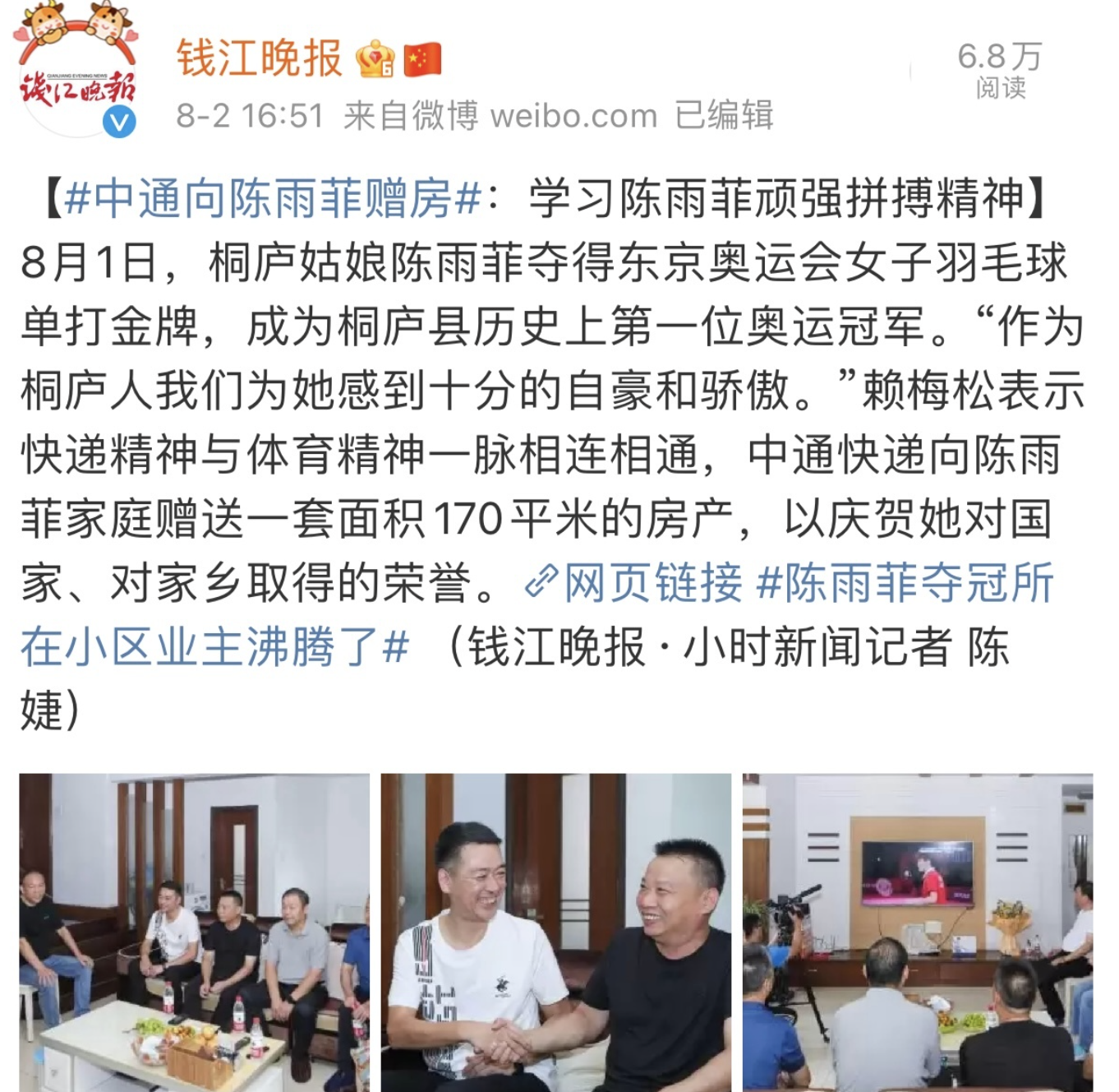 中通向奥运冠军陈雨菲赠房后,韵达也赠了一套房,好家伙快递公司卷起来了?韵达速递作为浙江桐庐籍民营快递企业,对陈雨菲的夺冠表示热烈祝贺。陈雨菲的夺冠是国家的荣誉,也是桐庐家乡人的骄傲,为此,赠送桐庐桐韵家园房产一套。据此前报道,中通速递赠送陈雨菲一套房。