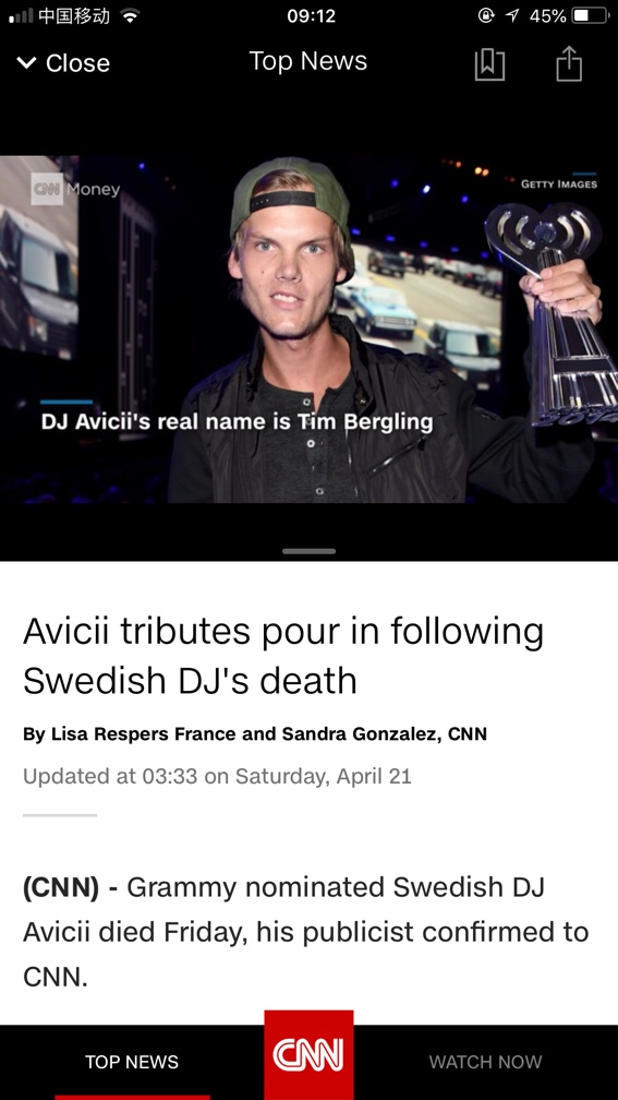 瑞典DJ Avicii(原名:Tim Bergling)于当地时间周五下午在阿曼去世,年仅28岁,死因尚未透露。