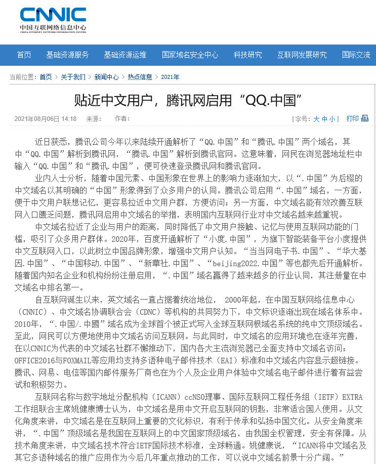 腾讯已启用QQ.中国域名,输入原域名显示无法访问。据中国互联网络信息中心官网,腾讯公司今年陆续开通解析了“QQ.中国”与“腾讯.中国”两个域名。其中,“QQ.中国”解析到腾讯网,“腾讯.中国”解析到腾讯官网。目前,在浏览器地址栏中输入“QQ.中国”便可进入腾讯网,输入“腾讯.中国”暂时显示“无法访问此网站”。据了解,2010 年,“.中国 / .中國”域名成为全球首个被正式写入全球互联网根域名系统的纯中文顶级域名。