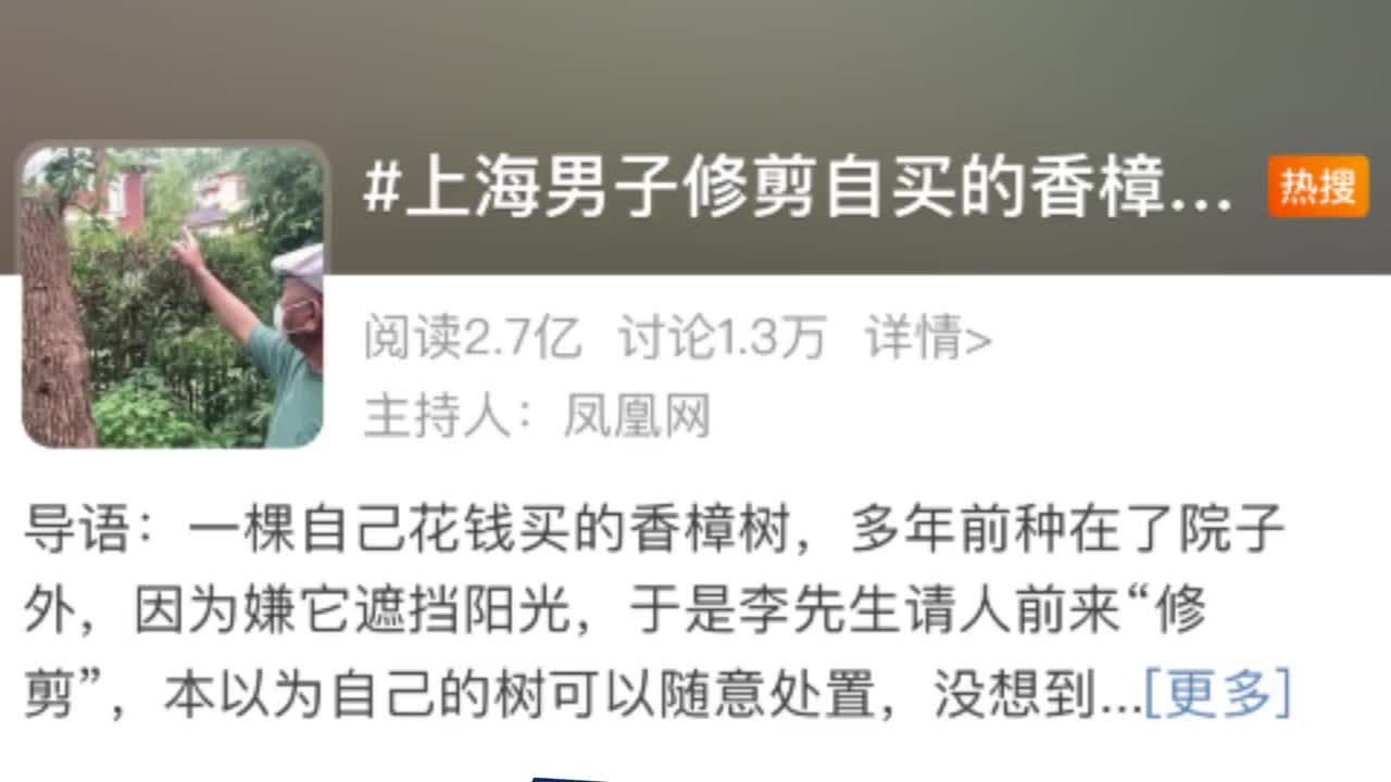 上海一居民修剪自种香樟树被罚14万?城管部门这样解释。8月15日,上海男子修剪自买的香樟树被罚14万的话题冲上微博热搜,引发热议。城管部门解释:个人未经区绿化部门审批前,没有权利对公共绿地上的树木进行移植和砍伐。(via 澎湃新闻)