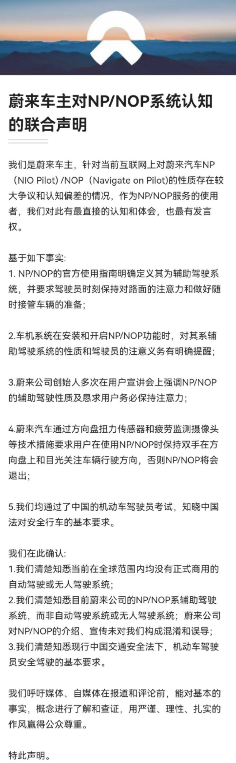 蔚来车主发布对自动辅助驾驶的联合声明。