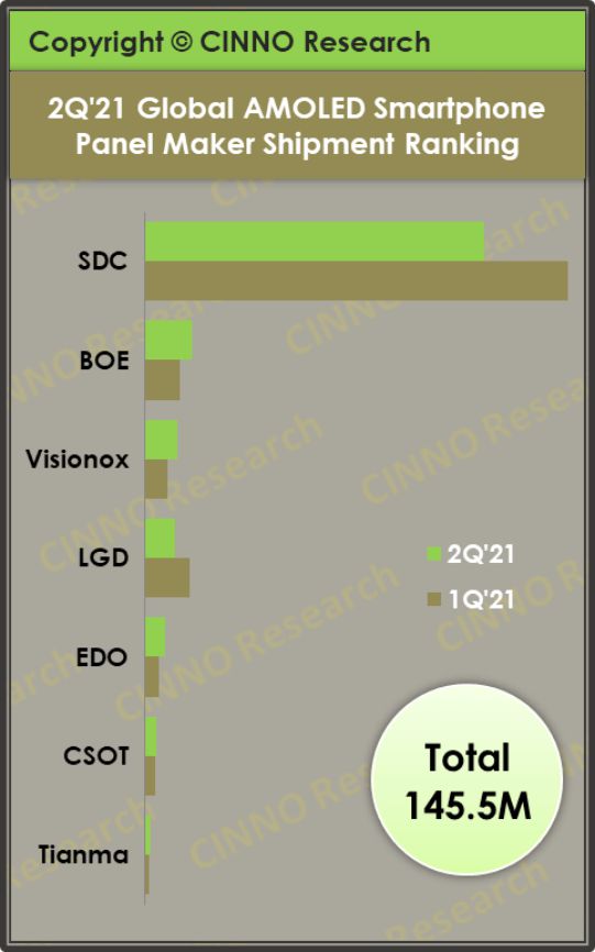 咨询机构CINNO在8月18日晚间发布2021年第二季度AMOLED出货量,首位仍然是三星,但其份额首度跌穿70%,第二位的京东方猛增36%。原来的第三位LG,份额环比急降32%,其位置被另一国产面板厂商维信诺所追过。