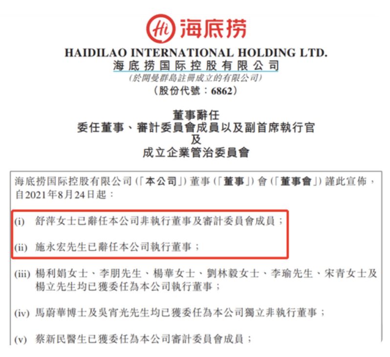 海底捞董事会巨震,张勇妻子舒萍、二把手施永宏辞任。8月24日,海底捞在港交所发布公告称,自2021年8月24日起:舒萍女士已辞任本公司非执行董事及审计委员会成员;施永宏先生已辞任本公司执行董事。杨利娟女士、李朋先生、杨华女士、刘林毅女士、李瑜先生、宋青女士及杨立先生均已获委任为本公司执行董事;马蔚华博士及吴宵光先生均已获委任为本公司独立非执行董事;蔡新民医生已获委任为本公司审计委员会成员;杨利娟女士已获委任为本公司副首席执行官;及本公司企业管治委员会已成立。