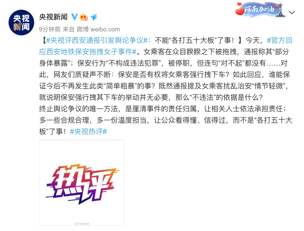 央视评西安通报引发舆论争议:不能“各打五十大板”了事!
