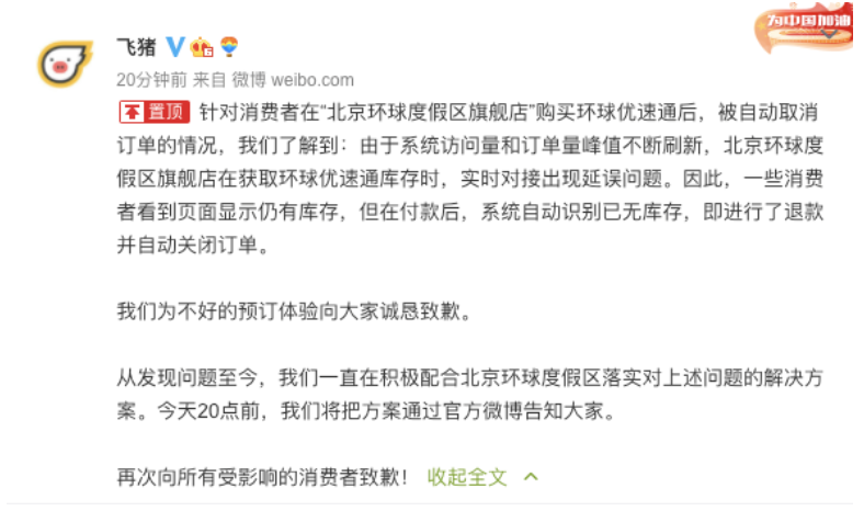 9月14日,飞猪官方微博发布致歉声明称,针对消费者在“北京环球度假区旗舰店”购买环球优速通后,被自动取消订单的情况,我们了解到:由于系统访问量和订单量峰值不断刷新,北京环球度假区旗舰店在获取环球优速通库存时,实时对接出现延误问题。