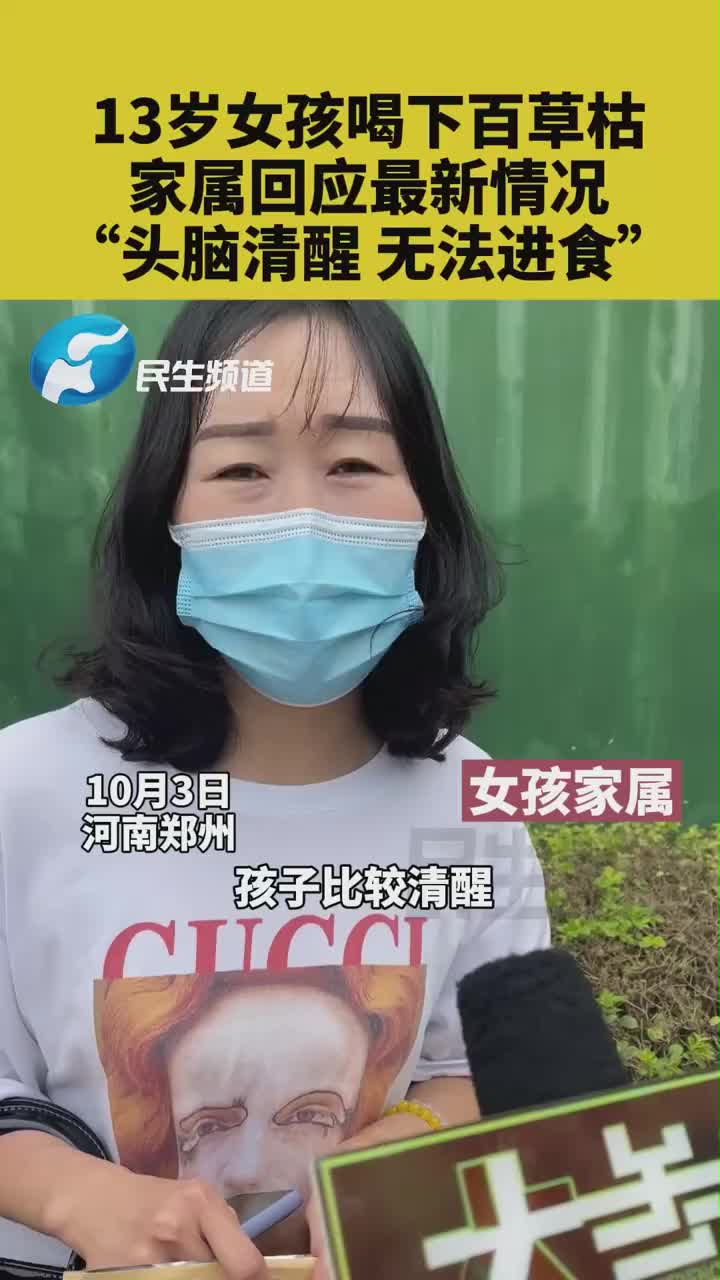 13岁女孩喝百草枯检查结果已出来家属:孩子比较清醒,就是不能吃东西喝水。“13岁女孩喝下百草枯”的事情一会牵动着大家的心,据家属讲,现在女孩比较清醒,就是不能吃东西,不能喝水,神经等各方面都比较好。目前,郑州、北京和山东相关医疗专家都已对女孩进行了会诊,希望女孩能尽快恢复健康。(via 大参考)