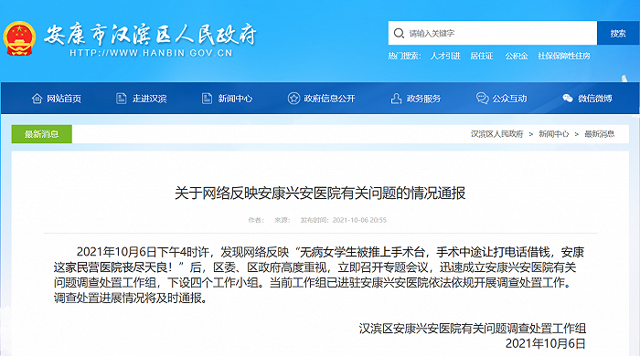 陕西安康网传“无病女生被推上手术台”,官方通报:成立工作组进驻医院开展调查。据陕西省安康市汉滨区政府网站消息,10月6日下午4时许,发现网络反映“无病女学生被推上手术台,手术中途让打电话借钱,安康这家民营医院丧尽天良!”后,区委、区政府高度重视,立即召开专题会议,迅速成立安康兴安医院有关问题调查处置工作组,下设四个工作小组。当前工作组已进驻安康兴安医院依法依规开展调查处置工作。调查处置进展情况将及时通报。