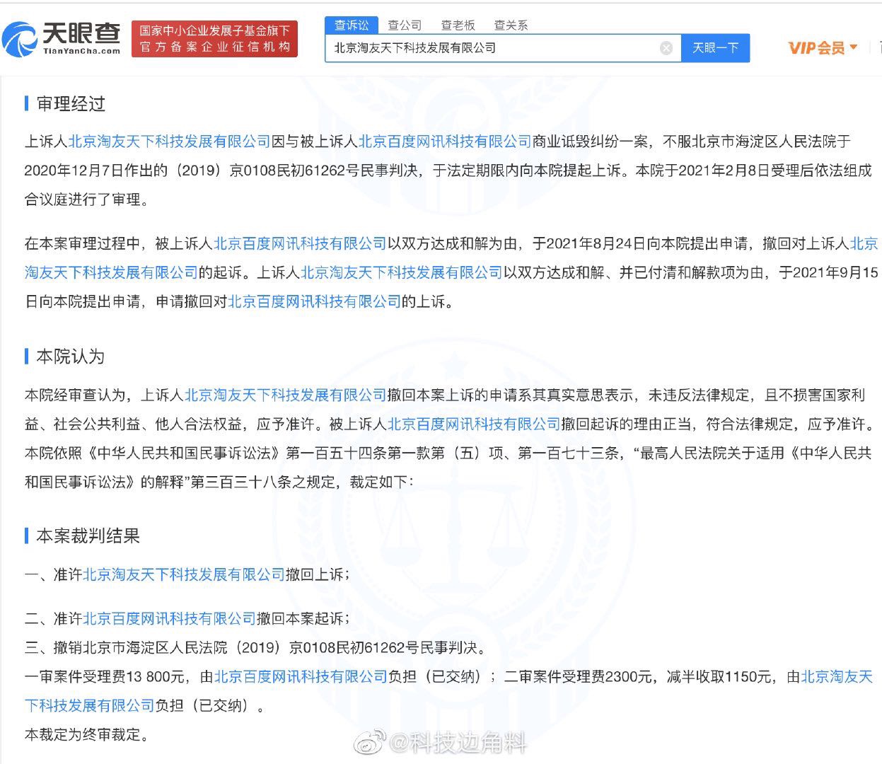脉脉公司不服一审判决提起上诉,审理过程中,百度以双方达成和解为由撤诉起诉,脉脉公司也以达成和解、已付清和解款项为由向提起撤诉。北京知识产权法院准许二者撤诉请求,同时撤销海淀区法院一审民事判决。百度负担一审案件受理费13800元,脉脉负担二审案件受理费1150元。