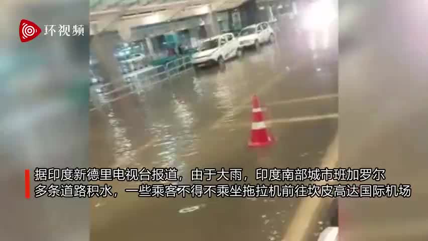 据印度新德里电视台报道,由于10月11日的暴雨,印度南部城市班加罗尔多条道路积水,一些乘客不得不乘坐拖拉机前往坎皮高达国际机场(KIAL)的航站楼。