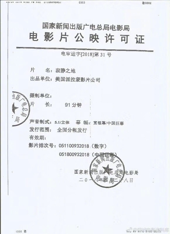 《寂静之地》公映许可证出炉,豆瓣和烂番茄均显示90分钟时长,一刀未剪。