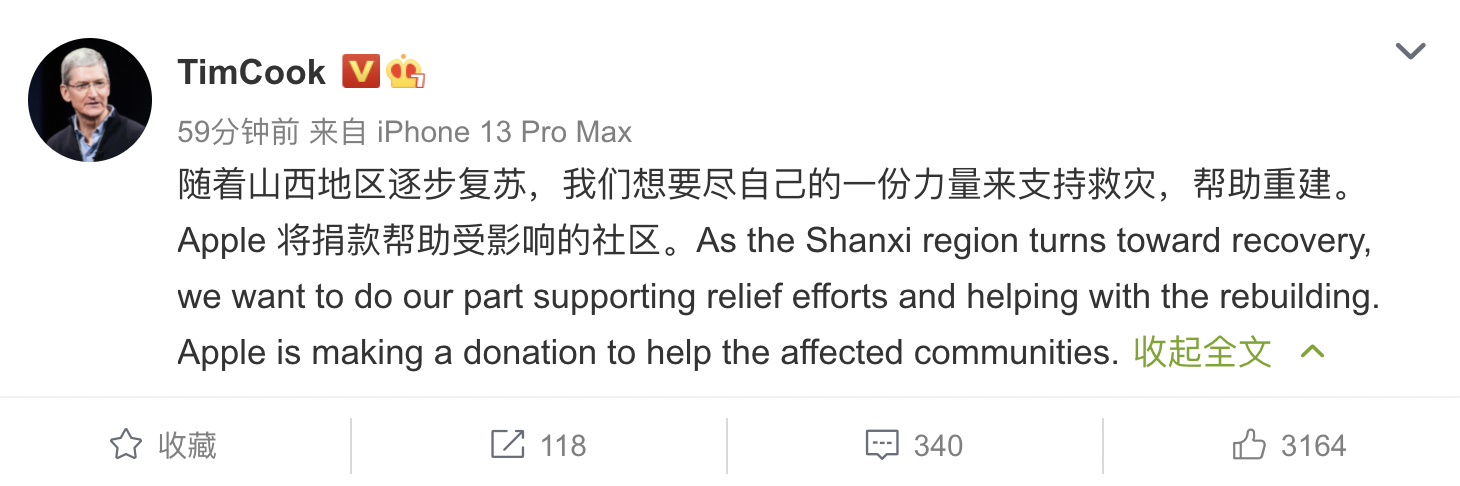 库克:苹果将捐款帮助山西受灾情影响的社区。