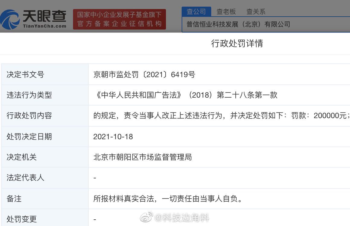宜人贷关联公司普信恒业科技发展(北京)有限公司,日前被指违反《广告法》(2018)第二十八条第一款行政处罚内容的规定,北京市朝阳区市场监督管理局责令其改正违法行为,罚款20万元,决定书文号:京朝市监处罚〔2021〕6419号。
