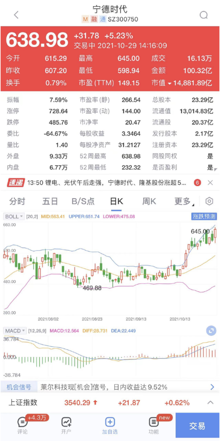 宁德时代午后涨近6%,市值首次突破1.5万亿。10月29日,宁德时代再创新高,现涨超5%,主力净流入14亿元。消息称特斯拉向宁德时代预订45GWh电池。宁德时代总市值升破1.5万亿元,距离排名第二的工商银行仅逾600亿元,本周5个交易日3次刷新历史高点。