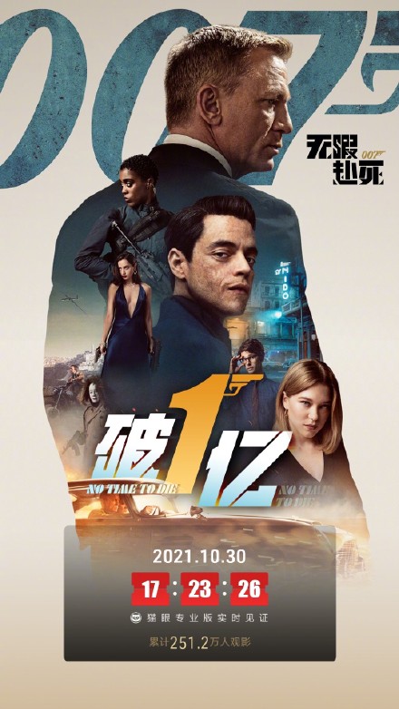 新一部邦德电影《007无暇赴死》上映第二天中国内地票房破1亿元。 《007:无暇赴死》是007系列电影的第25部,由凯瑞·福永执导,丹尼尔·克雷格、拉尔夫·费因斯、娜奥米·哈里斯、蕾雅·赛杜、本·卫肖等主演的冒险动作片。该片于2021年10月8日在美国上映,2021年10月29日在中国内地上映。