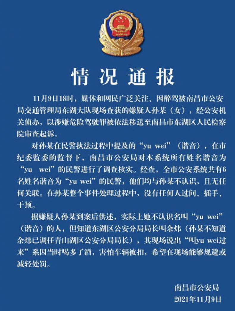 据嫌疑人孙某到案后供述,实际上她不认识名叫“yu wei'(谐音)的人,但知道东湖区公安分局局长叫余炜(孙某不知道 余炜已调任青山湖区公安分局局长),其现场说出“叫yu wei过来”系因当时喝多了酒,害怕车辆被扣,希望在现场能够规避或减轻处罚。
