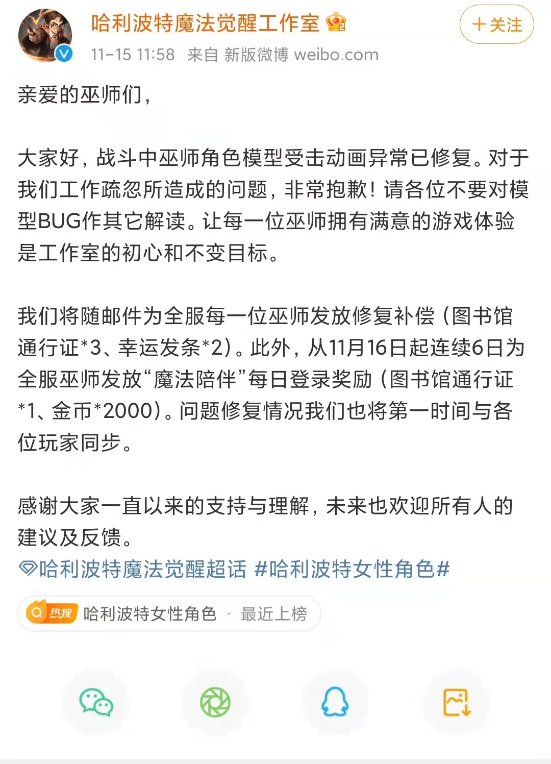 哈利波特魔法觉醒工作室就动画争议致歉:角色模型受击动画异常已修复。11月15日,哈利波特魔法觉醒工作室微博发文称:战斗中巫师角色模型受击动画异常已修复。对于我们工作疏忽所造成的问题,非常抱歉。请各位不要对模型BUG作其它解读。11月14日晚间,哈利波特魔法觉醒工作室微博发文回应游戏角色受击动画争议称:关于女性巫师受击动画异常的BUG情况我们已知悉,BUG原因为舌头未经过受击处理,错误的穿过了下巴。