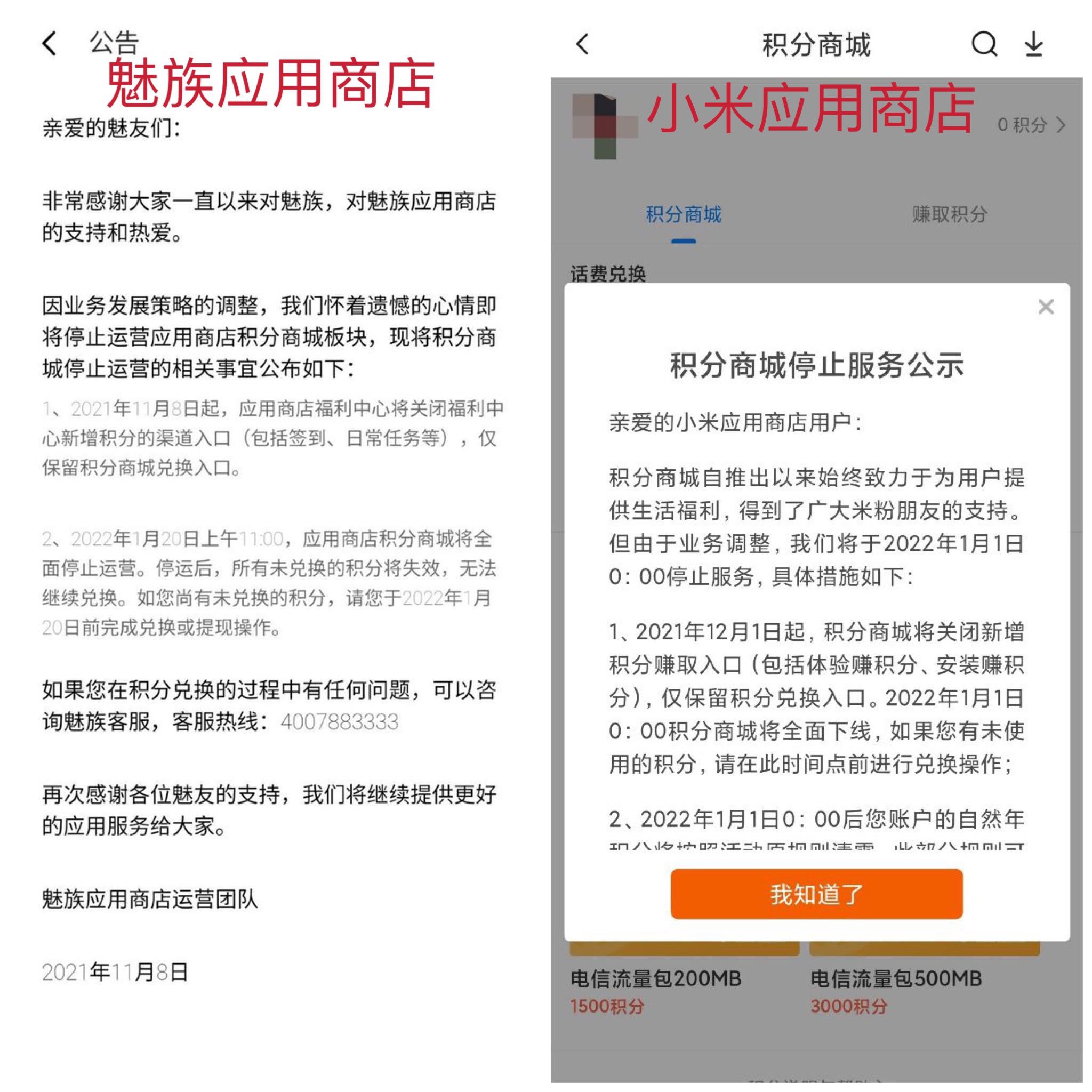 近期,小米、魅族纷纷关闭了应用商店的“积分商城”。小米应用商店发布公告称,小米应用商店的积分商城宣布将于 2022 年 1 月 1 日 0 点停止服务。魅族的公告显示,2022 年 1 月 20 日上午 11:00,应用商店积分商城将全面停止运营。