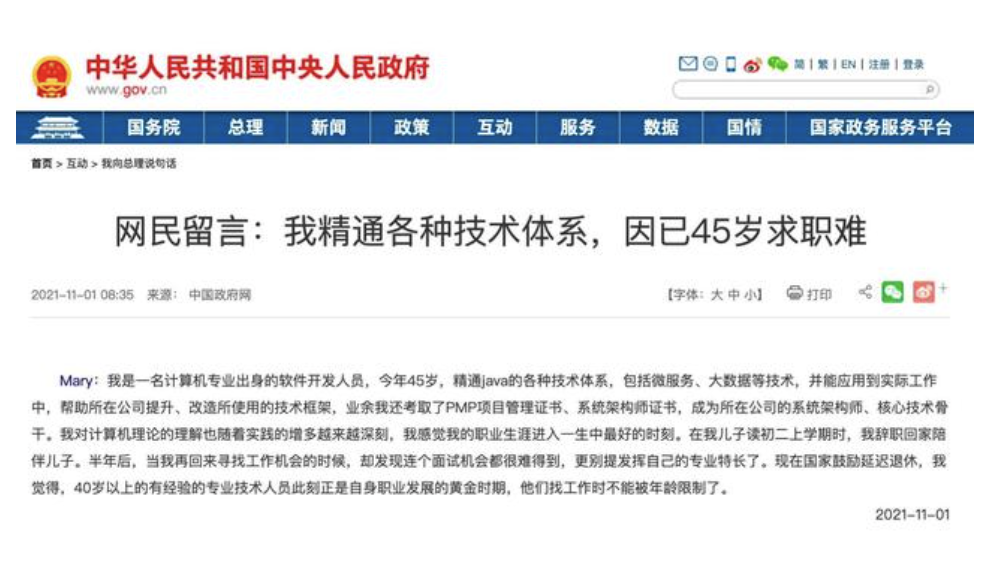 近日,一位45岁的网民在中国政府网留言求职,引发关注。该网民自称是一名软件开发人员,今年45岁,精通各种技术体系,“而我辞职回家半年后再回来寻找工作机会的时候,却发现连个面试机会都很难得到。”
