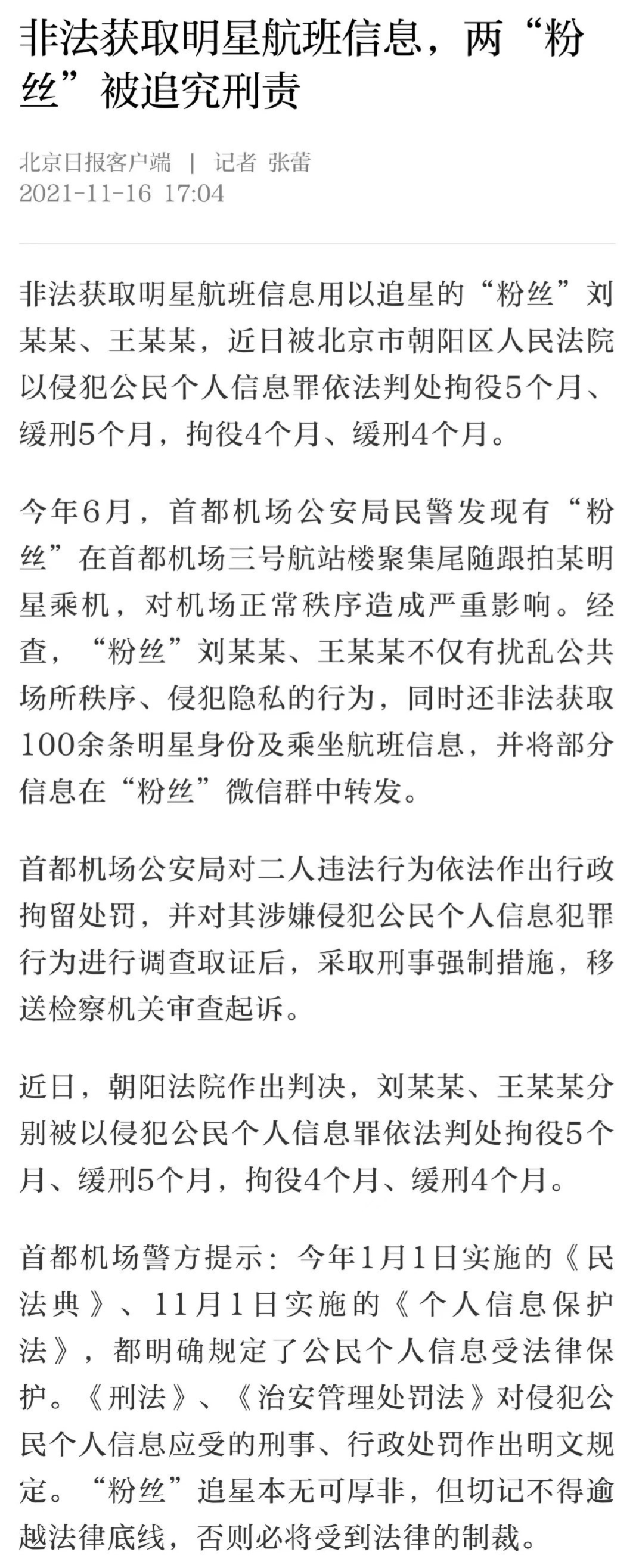 首都机场公安局对二人违法行为依法作出行政拘留处罚,并对其涉嫌侵犯公民个人信息犯罪行为进行调查取证后,采取刑事强制措施,移送检察机关审查起诉。近日,朝阳法院作出判决,刘某某、王某某分别被以侵犯公民个人信息罪依法判处拘役5个月、缓刑5个月,拘役4个月、缓刑4个月。