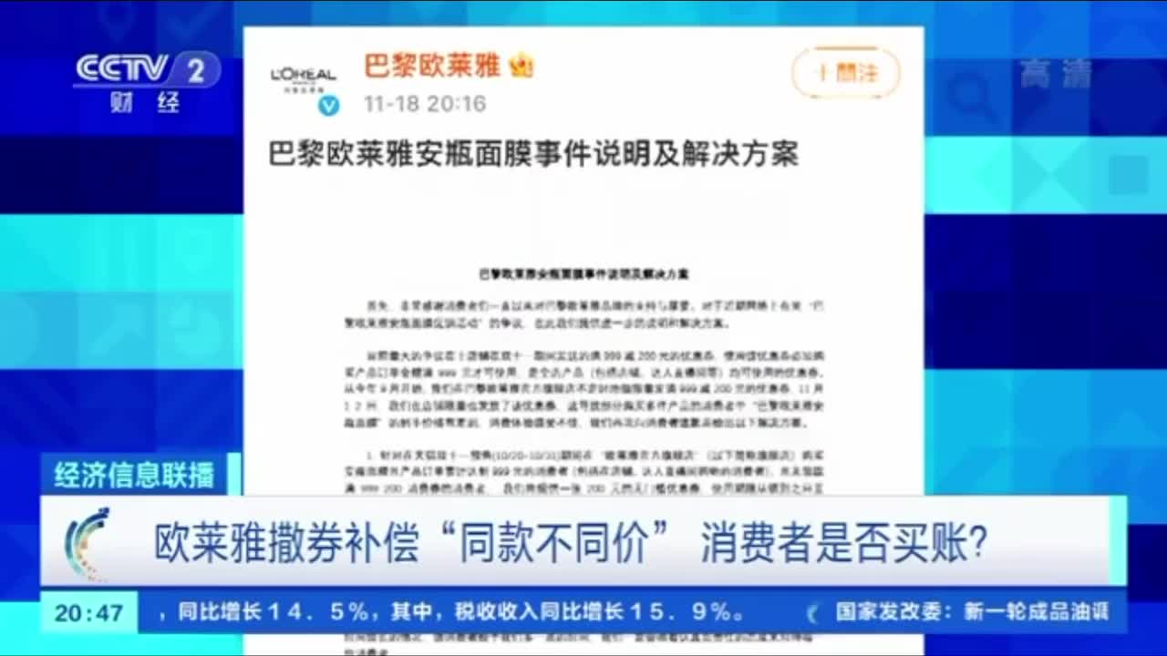 欧莱雅撒券补偿评论炸锅,部分消费者:我要这券有何用;专家:消费者若不满意可继续投诉或起诉。这几天,美妆品牌欧莱雅发售的一款面膜,因为在一些电商主播直播间的预售价比双十一当天现货价贵出不少,引发消费者不满。昨天晚间,欧莱雅通过官方微博表示,将给相关用户赔偿优惠券。在评论区有网友留言:“我要你的券有什么用?还指望我再买吗?”专家表示,如果消费者对商家提出的解决方案不能接受,可以继续通过消协等相关机构投诉,或就商家涉嫌的违法行为进行起诉。(via 央视财经)