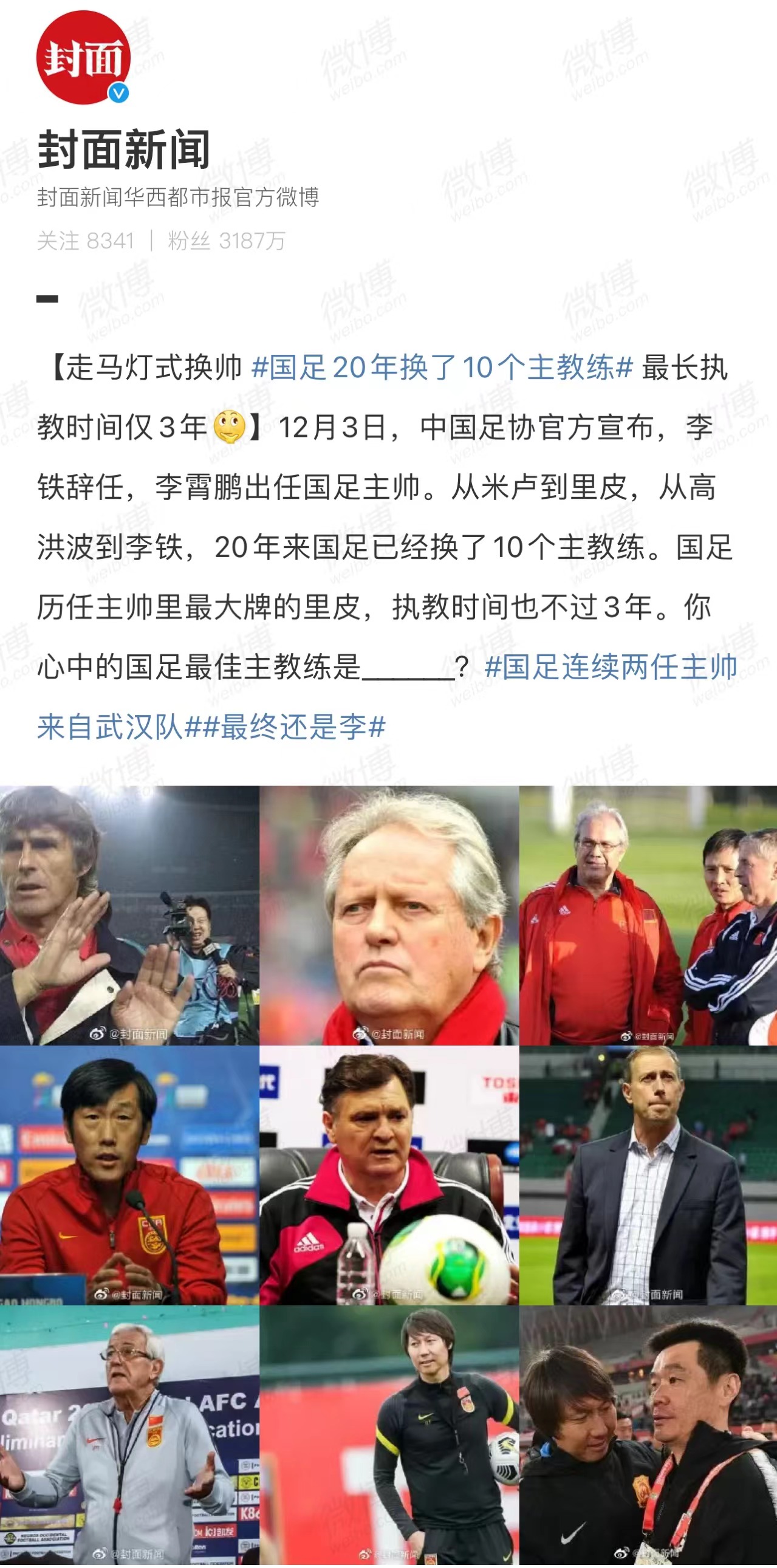 走马灯式换帅,国足20年换了10个主教练,最长执教时间仅3年。12月3日,中国足协官方宣布,李铁辞任,李霄鹏出任国足主帅。从米卢到里皮,从高洪波到李铁,20年来国足已经换了10个主教练。国足历任主帅里最大牌的里皮,执教时间也不过3年。你心中的国足最佳主教练是?