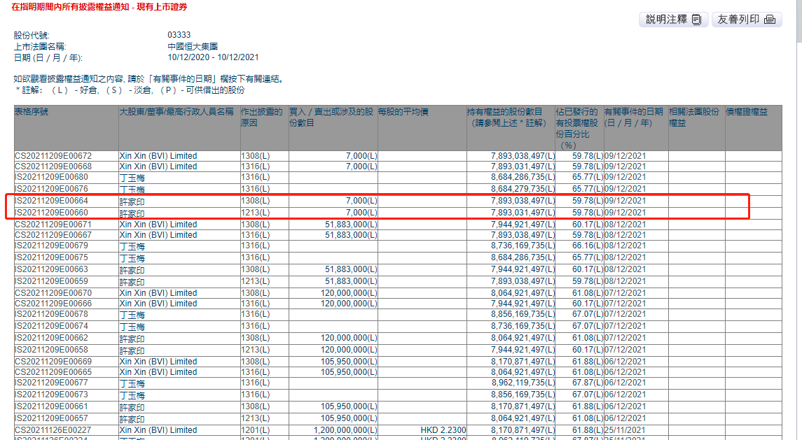 许家印在恒大的持股比例从61.88%降至59.78%。