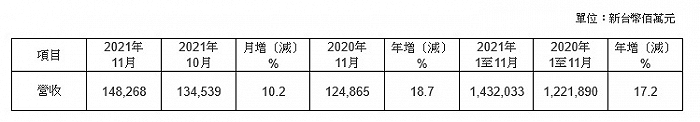 台积电:前11个月营收同比增加17.2%至1.43万亿新台币。12月10日,台积电网站公布2021年11月营收报告。2021年11月合并营收约为新台币1482.68亿元,较上月增加了10.2%,较去年同期增加了18.7%。累计2021年1至11月营收约为新台币1.43万亿元,较去年同期增加了17.2%。