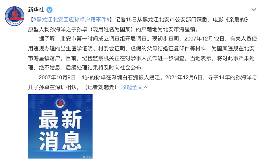 新华社记者12月15日从黑龙江北安市公安部门获悉,电影《亲爱的》原型人物孙海洋之子孙卓(现用姓名为国某)的户籍地为北安市海星镇。