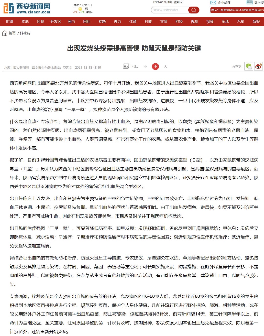 西安各大医院已相继接诊多例出血热患者,出现发烧头疼需提高警惕。2021年12月18日,据西安新闻网,今年入冬以来,我市各大医院已相继接诊多例出血热患者。由于流行性出血热早期症状和普通流感较相似,所以不少患者会误以为是普通的感冒。市疾控中心专家特别提醒:出血热发病急、进展快,一旦市民出现发烧发热等身体不适,应及时就医。出血热的治疗强调“三早一就”,接种疫苗是个人预防该病的最有效办法。