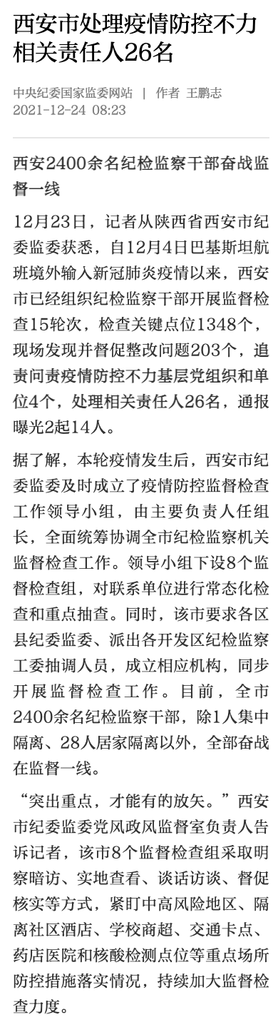 西安市处理疫情防控不力相关责任人26名。12月23日,记者从陕西省西安市纪委监委获悉,自12月4日巴基斯坦航班境外输入新冠肺炎疫情以来,西安市已经组织纪检监察干部开展监督检查15轮次,检查关键点位1348个,现场发现并督促整改问题203个,追责问责疫情防控不力基层党组织和单位4个,处理相关责任人26名,通报曝光2起14人。