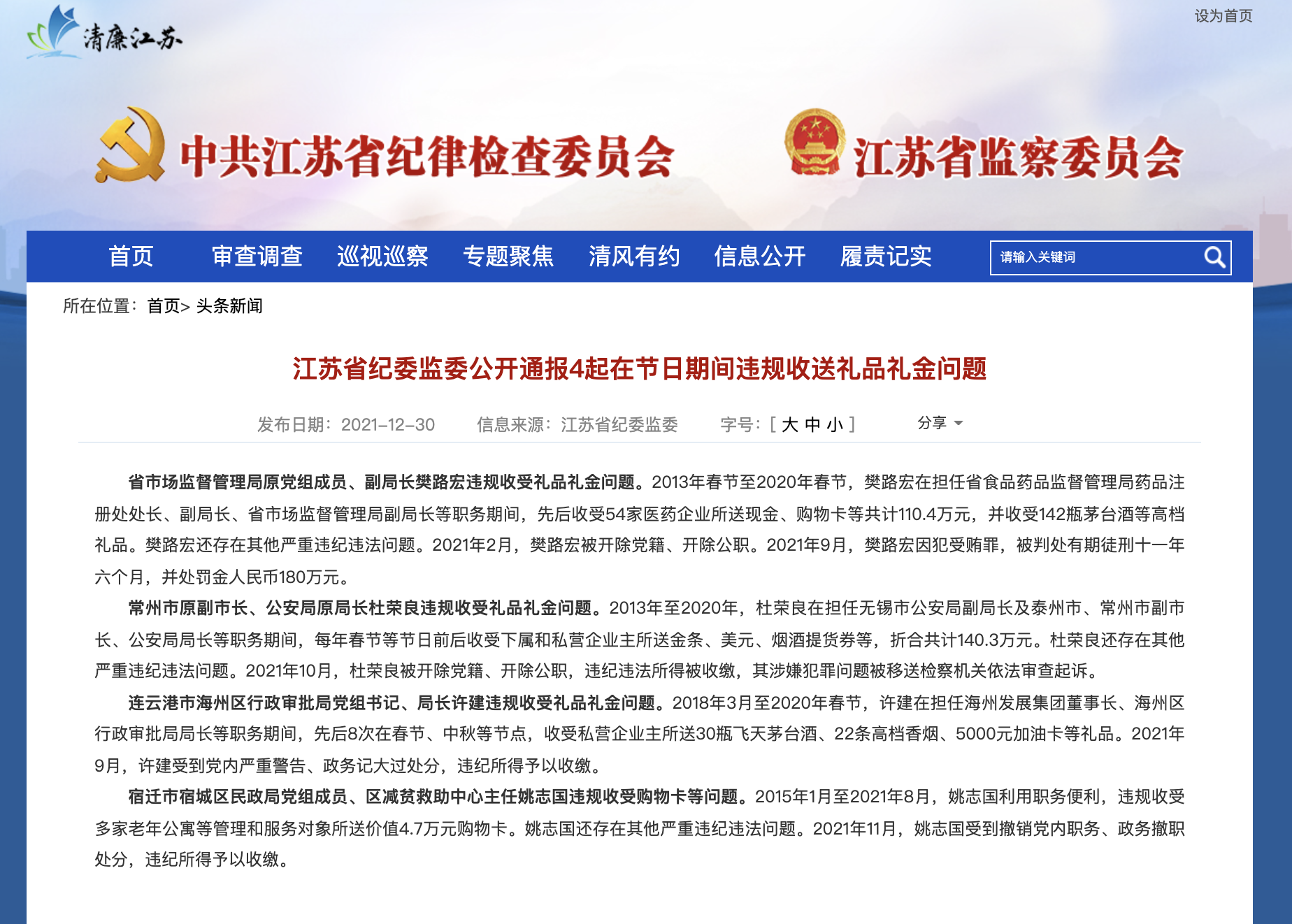 一副局长受贿142瓶茅台!江苏通报4起在节日期间违规收送礼品礼金问题。2013年春节至2020年春节,樊路宏在担任省食品药品监督管理局药品注册处处长、副局长、省市场监督管理局副局长等职务期间,先后收受54家医药企业所送现金、购物卡等共计110.4万元,并收受142瓶茅台酒等高档礼品。