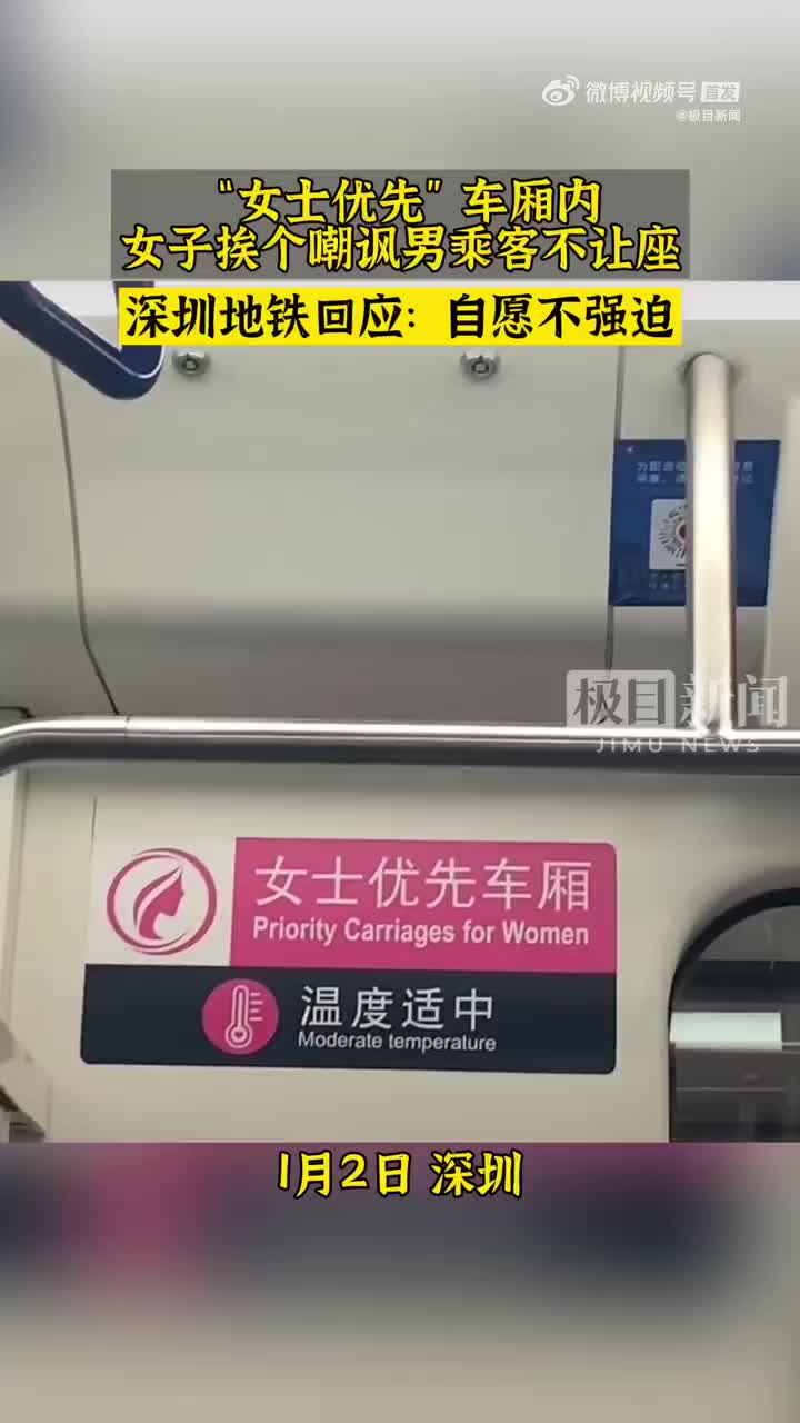 女子女士车厢内挨个嘲讽男乘客不让座,地铁回应:自愿原则。“恭喜你2022年成为美丽的女士,祝你减肥成功!”1月2日,一段女子在“女士优先车厢”内挨个嘲讽男乘客的网络视频引发热议。对此,深圳地铁表示,该车厢并未禁止男士使用,让座遵循自愿原则。港铁轨道交通(深圳)有限公司工作人员回应称,已将相关信息提交给公司相关人员。(via 极目新闻)