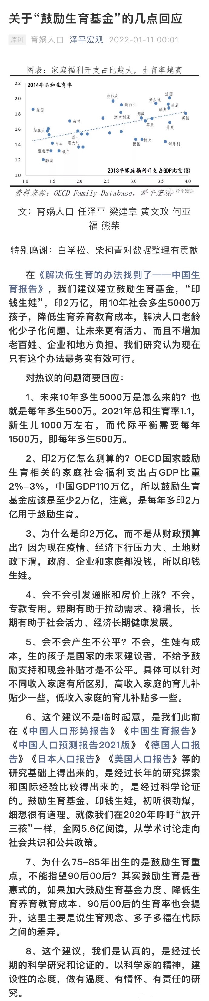 据泽平宏观1月11日消息,育娲人口、任泽平等发布关于“鼓励生育基金”的几点回应。回应称,这个建议不是临时起意,是经过长年的研究探索和国际经验比较得出来的,是经过科学论证的。此外,未来10年多生5000万是怎么来的?也就是每年多生500万。2021年总和生育率1.1,新生儿1000万左右,而代际平衡需要每年1500万,即每年多生500万。