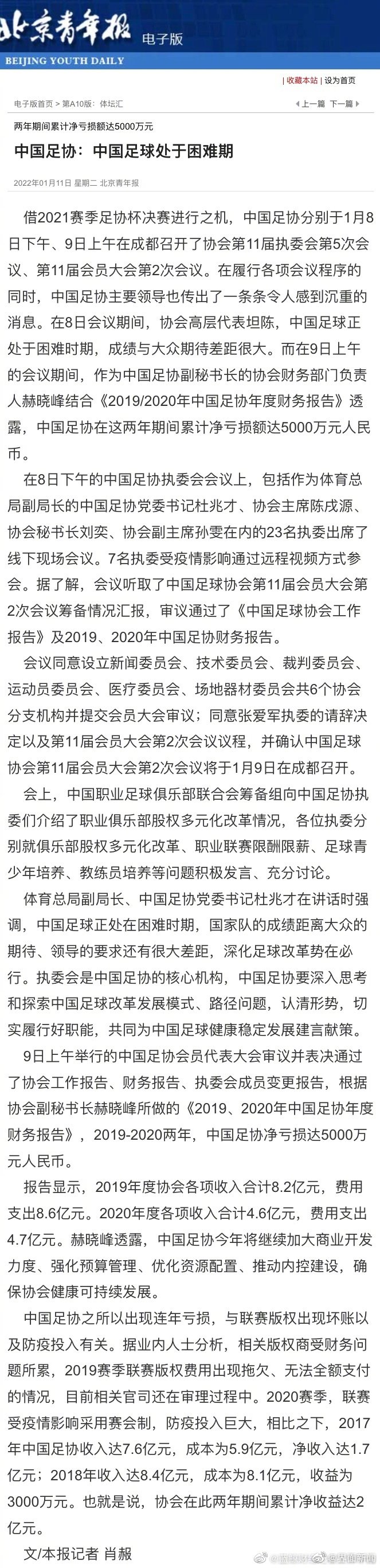 中足协两年累计净亏损5000万元,中足协称中国足球处于困难期。